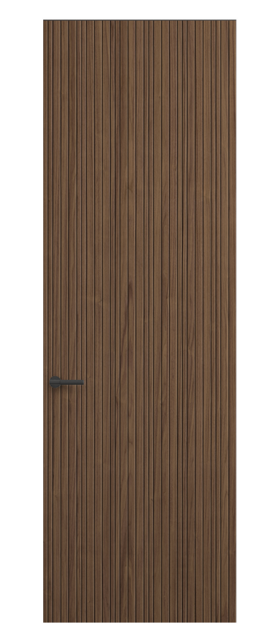 SELECT — коллекция минималистичных дверей с фрезеровкой по натуральному шпону. Рельеф на поверхности полотна создаёт игру света и тени, добавляя пространству динамичности и визуального объёма. Двери SELECT в сочетании со стеновыми панелями и мебельными фасадами, повторяющими лаконичный дизайн, создают единое стилевое решение.